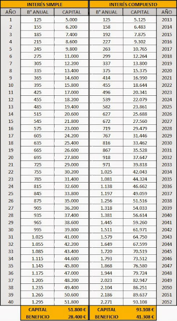 Vaya diferencia ¿eh?. Sobre todo si tenemos en cuenta que al cabo de 40 años sin reinvertir ganancias tendremos los 51.800€ del capital acumulado y únicamente los 1.295€ que nos generan ese año. Total, que en el año 40 acabamos con 53.095€. El beneficio del interés simple nos lo hemos ido comiendo año tras año.